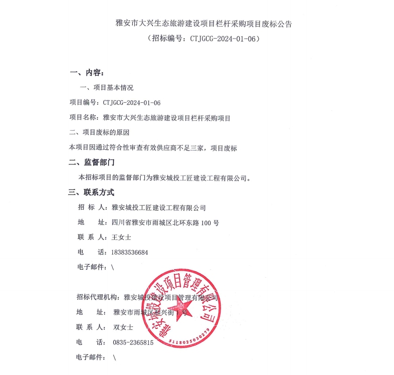雅安市大興生態(tài)旅游建設(shè)項目欄桿采購項目廢標公告