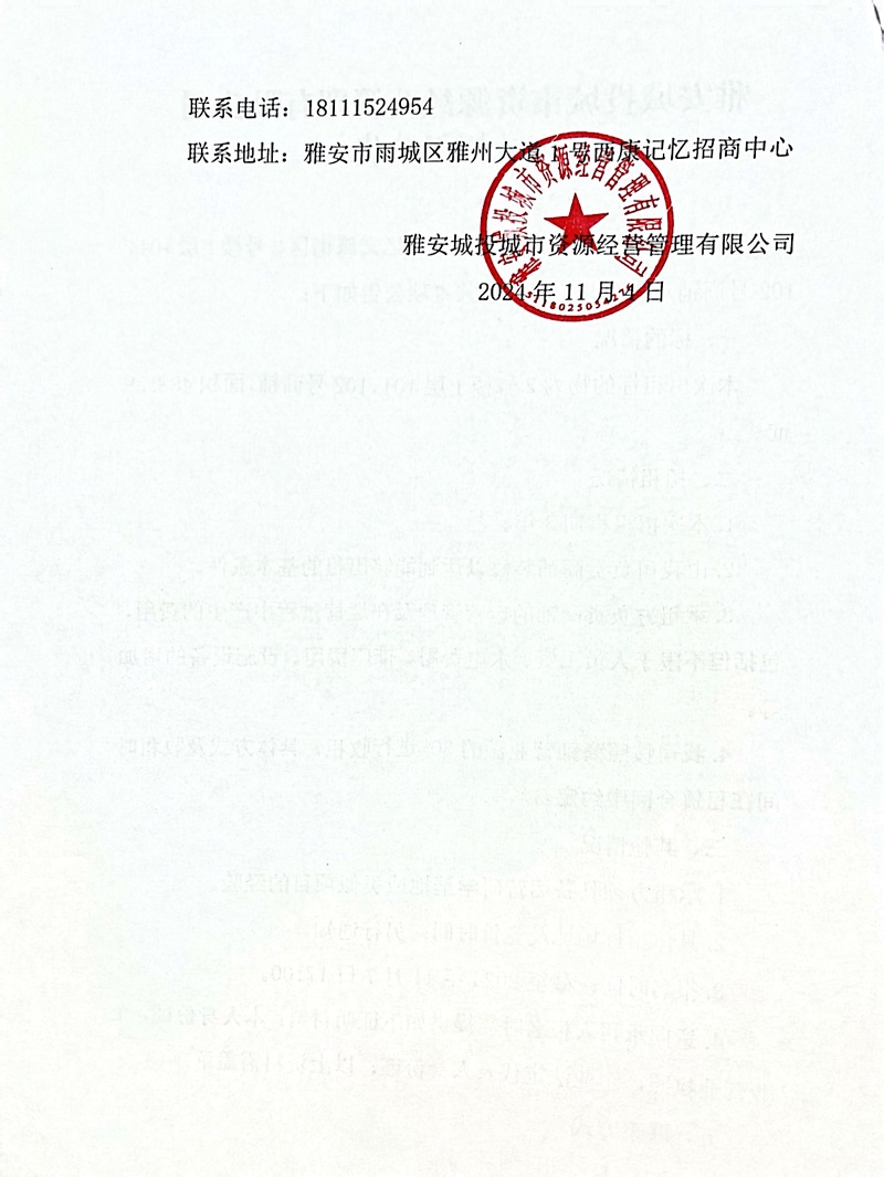 雅安城投城市資源經(jīng)營管理有限公司雅州大道1號西康記憶文旅街區(qū)2號樓1層101、102號商鋪招租的公告