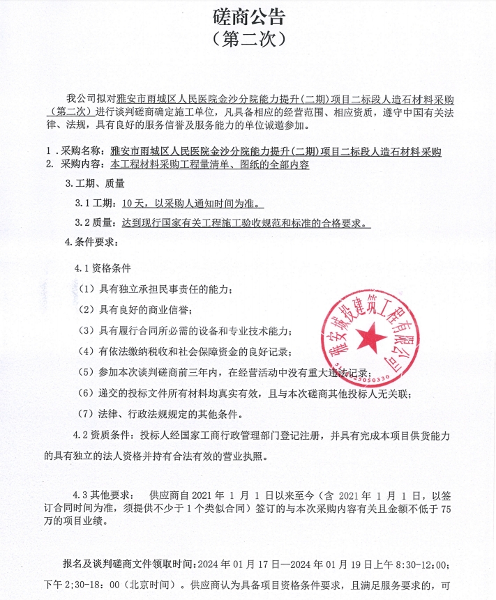 雅安市雨城區(qū)人民醫(yī)院金沙分院能力提升(二期)項目二標(biāo)段人造石材料(第二次)采購談判磋商公告