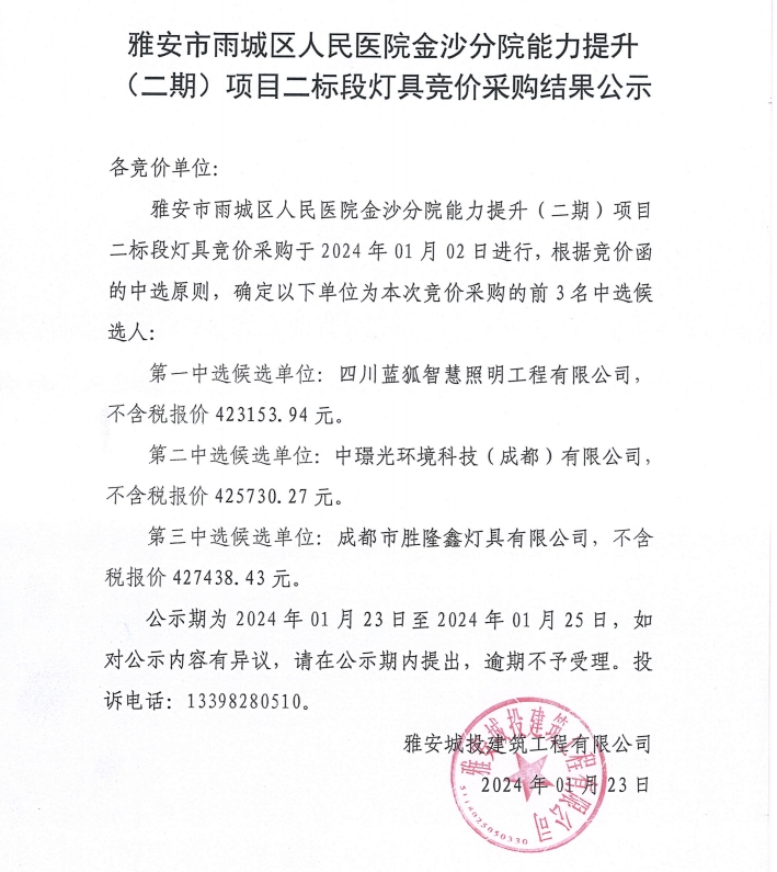 雅安市雨城區(qū)人民醫(yī)院金沙分院能力提升(二期)項目二標段燈具競價采購結(jié)果公示