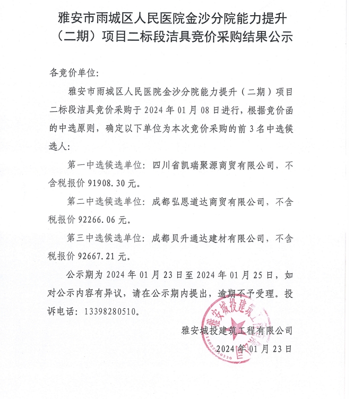 雅安市雨城區(qū)人民醫(yī)院金沙分院能力提升(二期)項(xiàng)目二標(biāo)段潔具競價(jià)采購結(jié)果公示