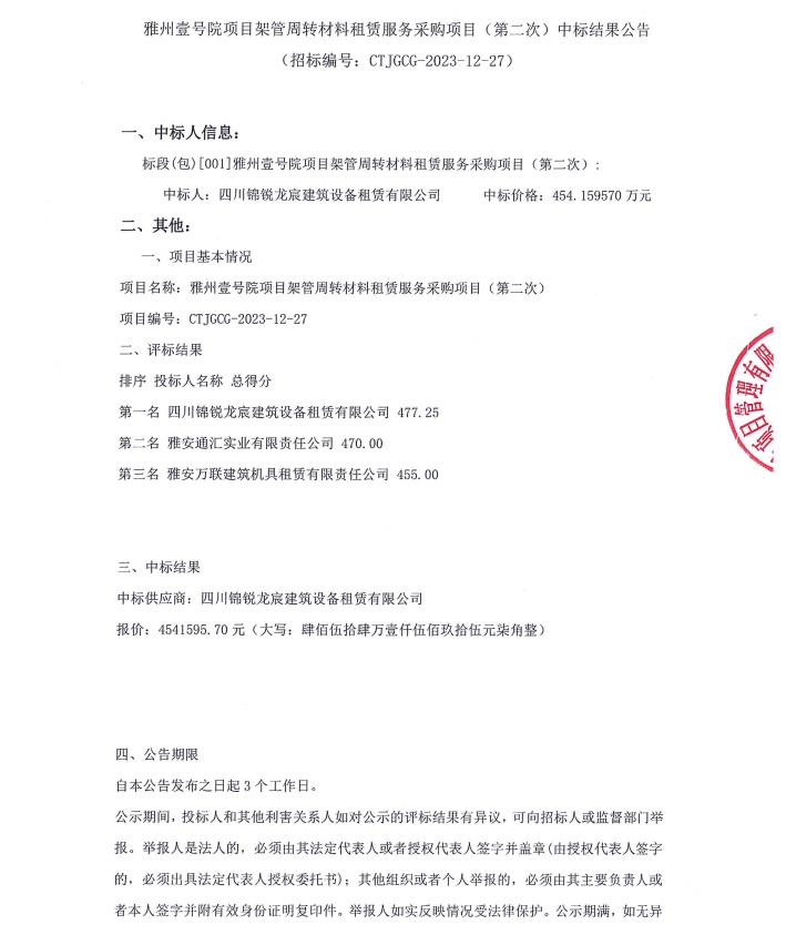雅州壹號院項(xiàng)目架管周轉(zhuǎn)材料租賃服務(wù)采購項(xiàng)目(第二次)中標(biāo)結(jié)果公告