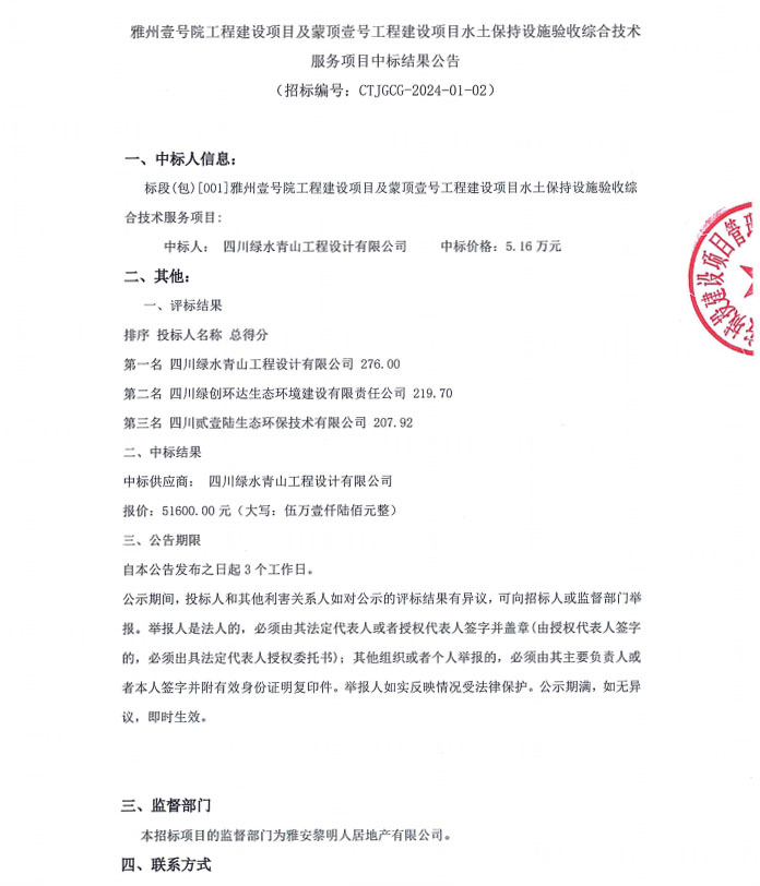 雅州壹號院工程建設項目及蒙頂壹號工程建設項目水土保持設施驗收綜合技術服務項目中標結果公告