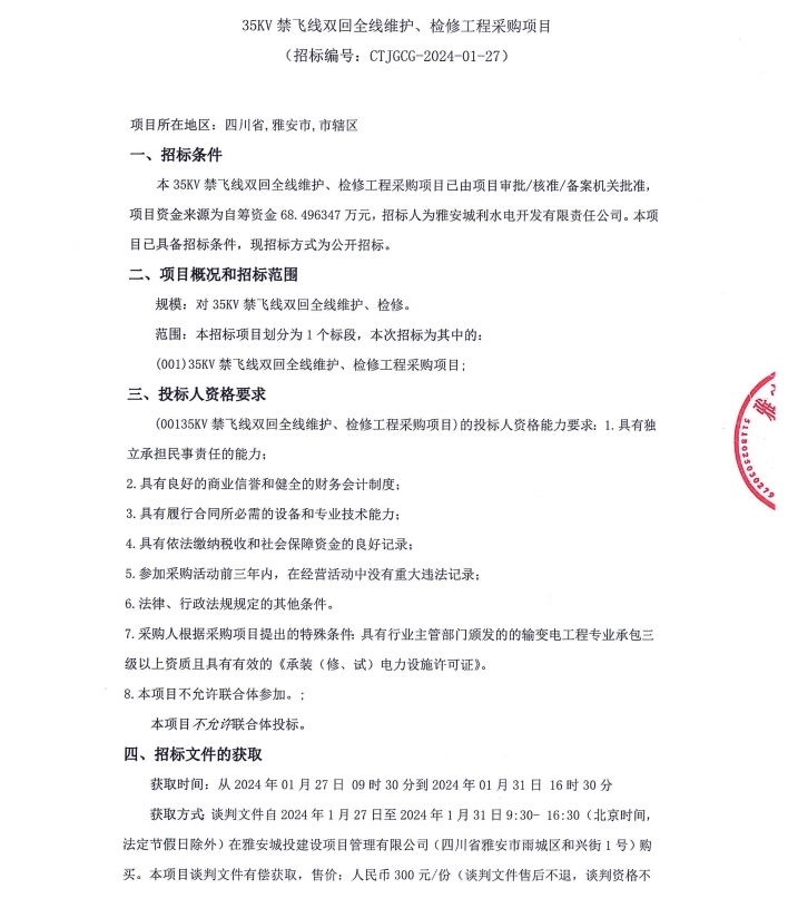35KV禁飛線雙回全線維護、檢修工程采購項目公告