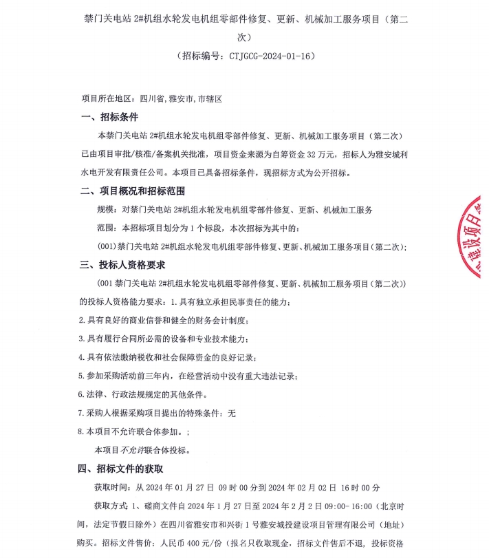 禁門(mén)關(guān)電站2#機(jī)組水輪發(fā)電機(jī)組零部件修復(fù)、更新、機(jī)械加工服務(wù)項(xiàng)目(第二次)公告