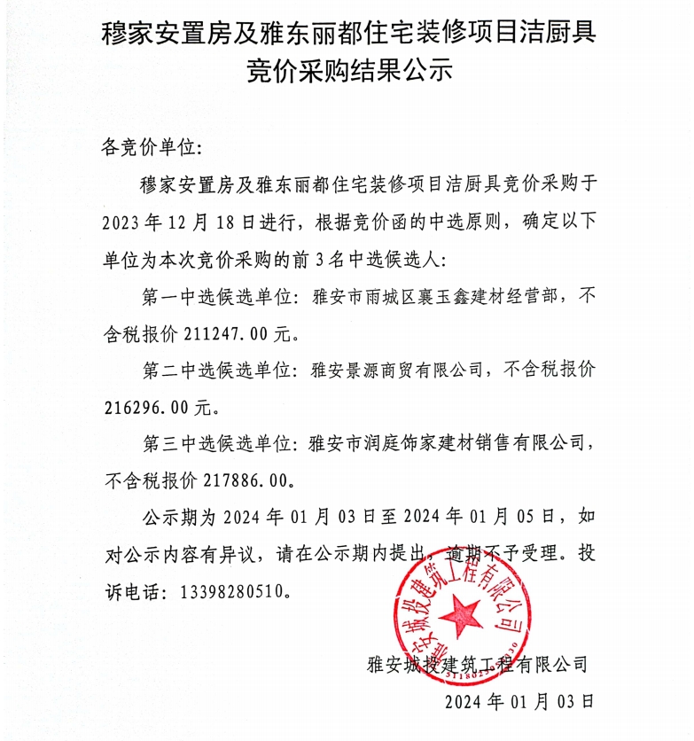 穆家安置房及雅東麗都住宅裝修項(xiàng)目潔廚具競(jìng)價(jià)采購結(jié)果公示