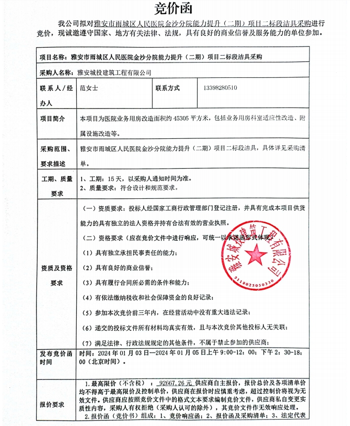 雅安市雨城區(qū)人民醫(yī)院金沙分院能力提升(二期)項(xiàng)目二標(biāo)段潔具采購競價(jià)公告