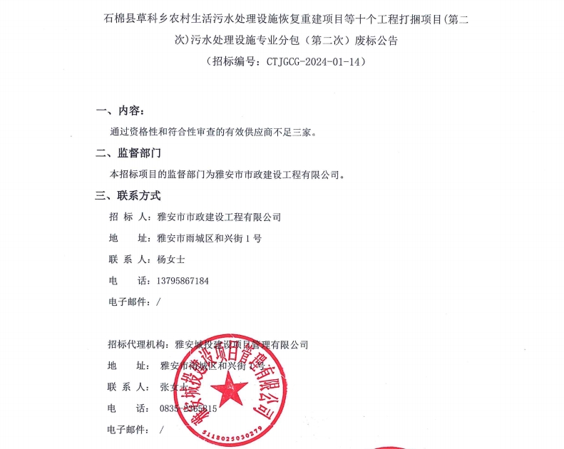 石棉縣草科鄉(xiāng)農(nóng)村生活污水處理設(shè)施恢復(fù)重建項目等十個工程打捆項目(第二次)污水處理設(shè)施專業(yè)分包(第二次)廢標(biāo)公告