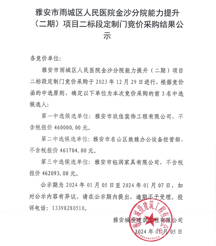 雅安市雨城區(qū)人民醫(yī)院金沙分院能力提升(二期)項(xiàng)目二標(biāo)段定制門(mén)競(jìng)價(jià)采購(gòu)結(jié)果公示