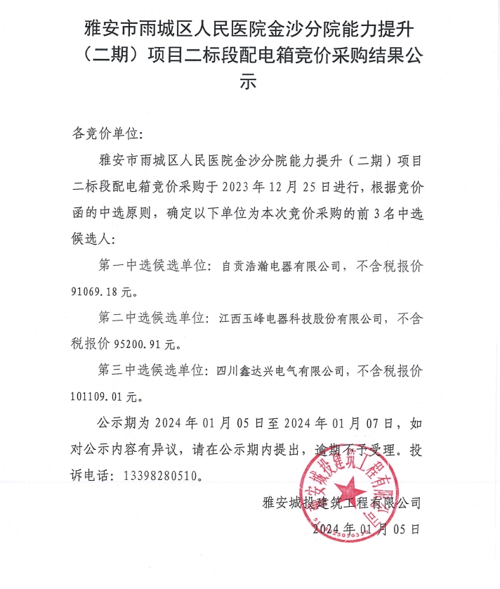 雅安市雨城區(qū)人民醫(yī)院金沙分院能力提升(二期)項目二標段配電箱競價采購結(jié)果公示