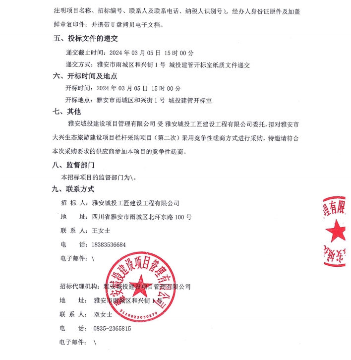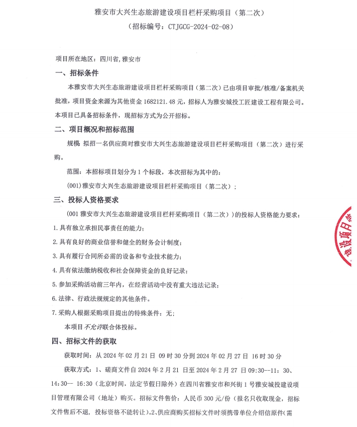 雅安市大興生態(tài)旅游建設(shè)項(xiàng)目欄桿采購(gòu)項(xiàng)目(第二次)公告