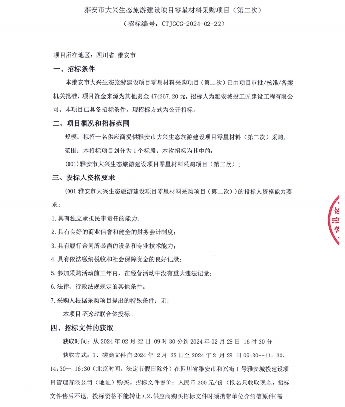 雅安市大興生態(tài)旅游建設(shè)項(xiàng)目零星材料采購項(xiàng)目(第二次)公告