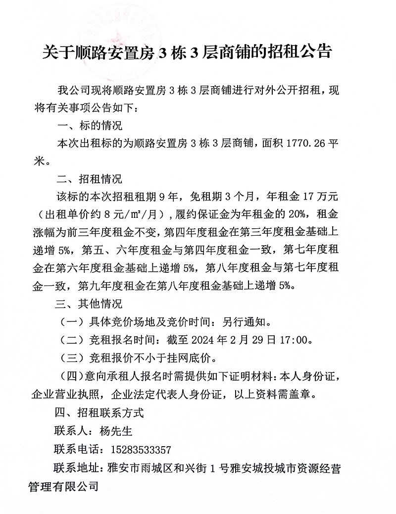 關(guān)于順路安置房3棟3層商鋪的招租公告