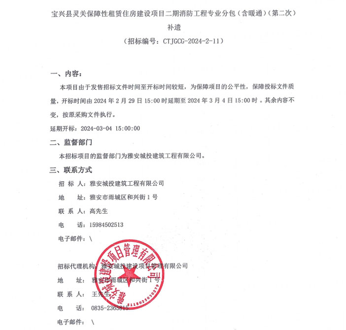 寶興縣靈關保障性租賃住房建設項目二期消防工程專業(yè)分包(含暖通)(第二次)補遺公告