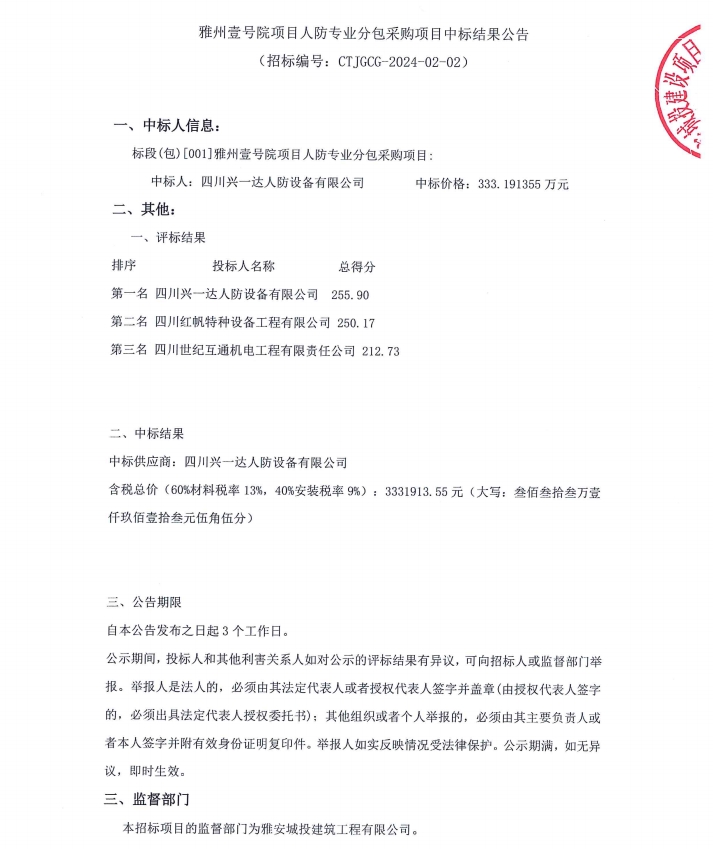 雅州壹號院項目人防專業(yè)分包采購項目中標結(jié)果公告