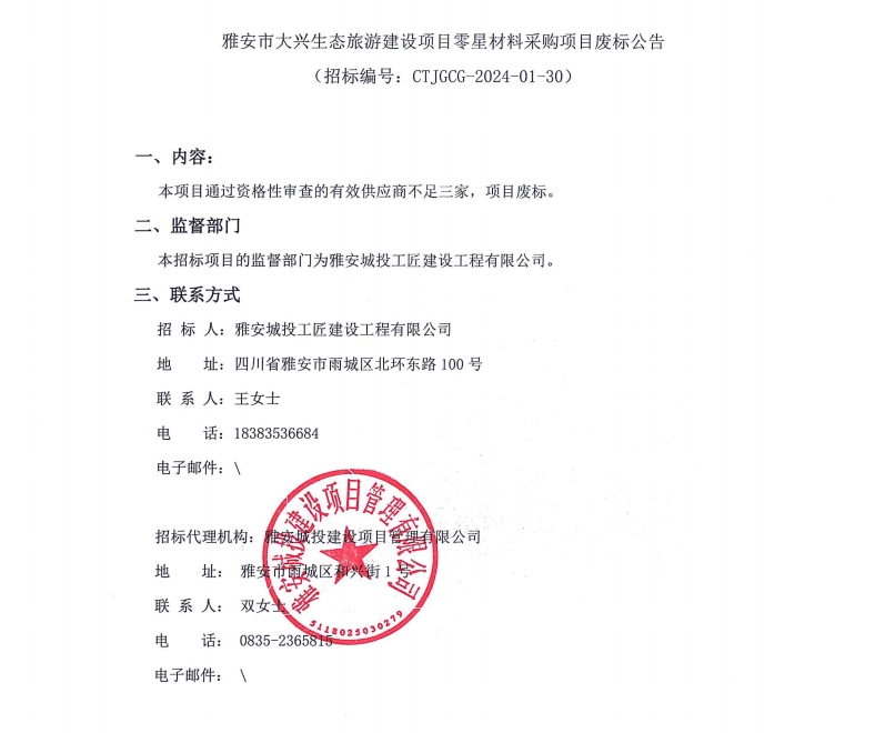 雅安市大興生態(tài)旅游建設項目零星材料采購項目廢標公告