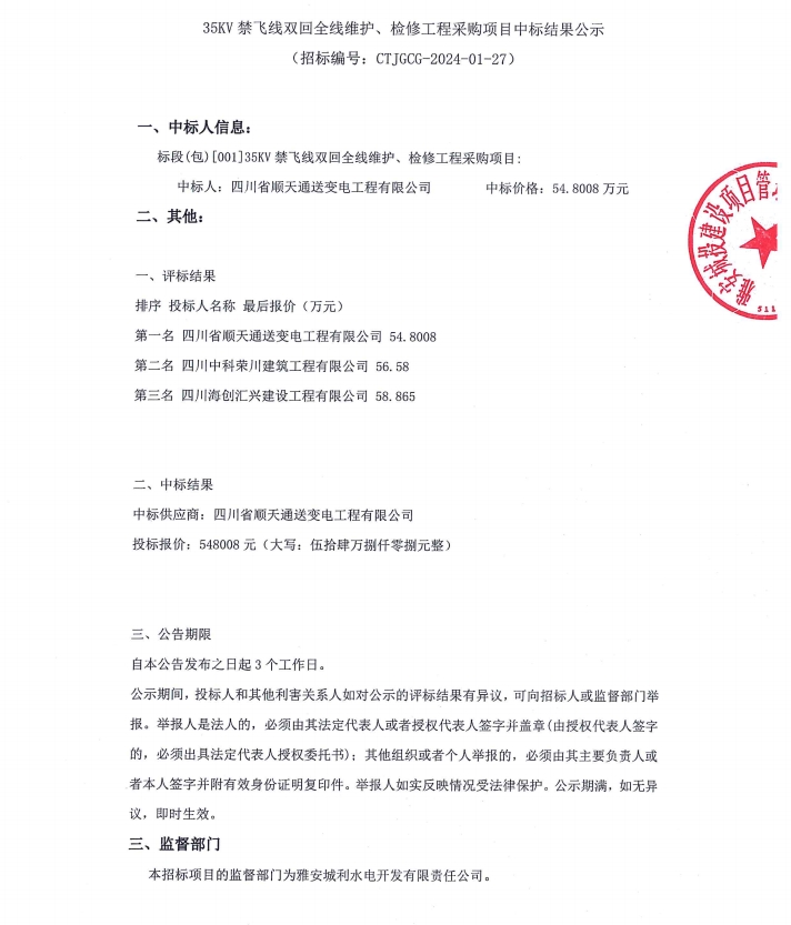 35KV禁飛線雙回全線維護(hù)、檢修工程采購項(xiàng)目中標(biāo)結(jié)果公示