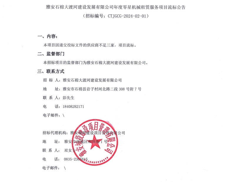 雅安石棉大渡河建設(shè)發(fā)展有限公司年度零星機(jī)械租賃服務(wù)項目流標(biāo)公告