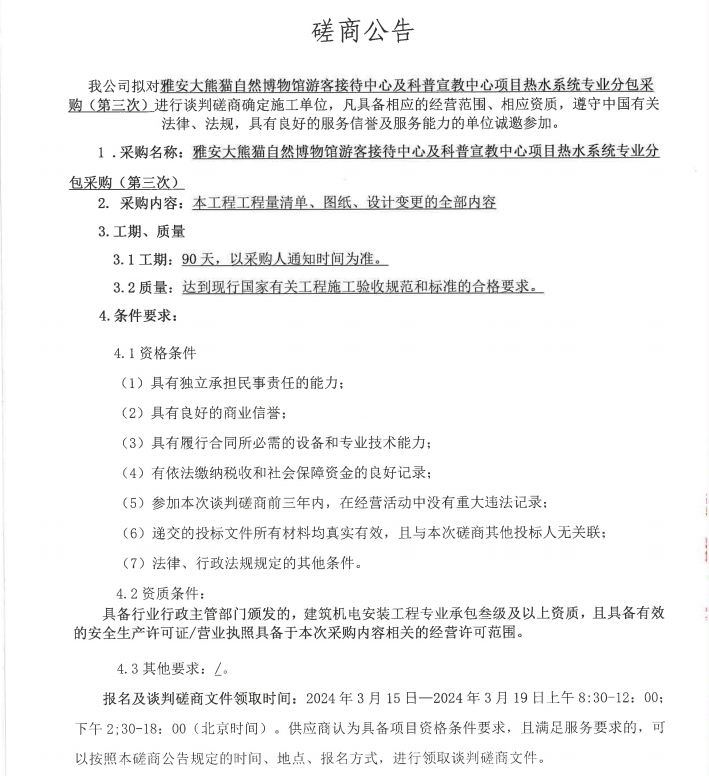 雅安大熊貓自然博物館游客接待中心及科普宣教中心項(xiàng)目熱水系統(tǒng)專業(yè)分包采購(gòu)(第三次)磋商公告