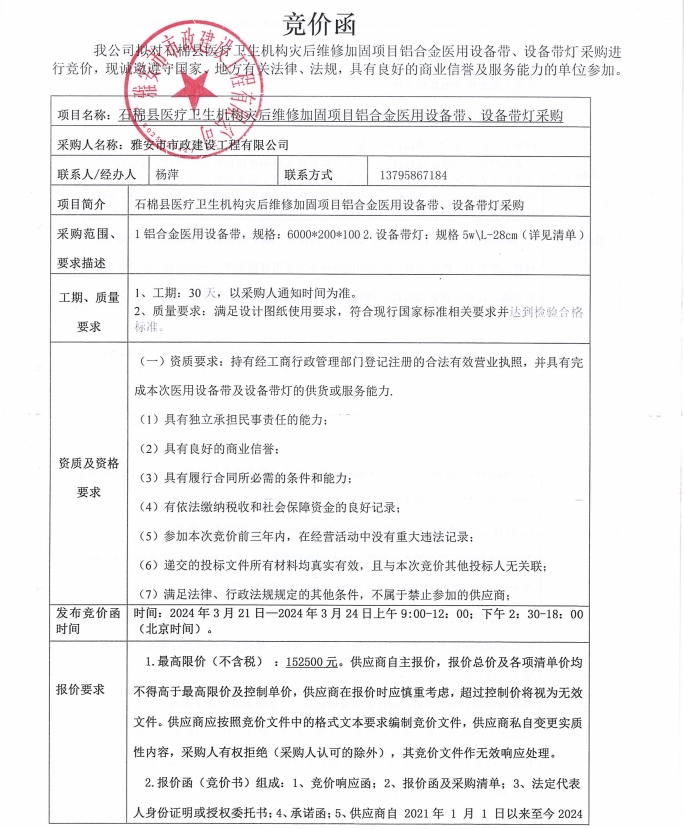 石棉縣醫(yī)療衛(wèi)生機(jī)構(gòu)災(zāi)后維修加固項(xiàng)目鋁合金醫(yī)用設(shè)備帶、設(shè)備帶燈采購競價(jià)公告