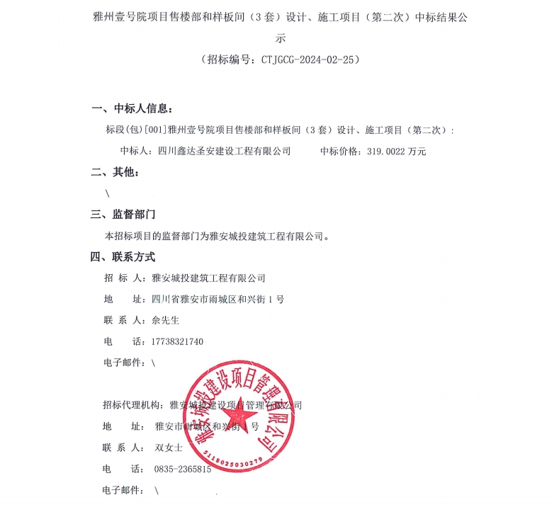 雅州壹號(hào)院項(xiàng)目售樓部和樣板間(3套)設(shè)計(jì)、施工項(xiàng)目(第二次)中標(biāo)結(jié)果公示