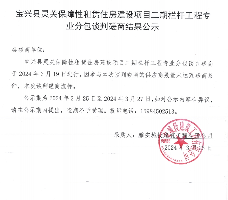 寶興縣靈關(guān)保障性租賃住房建設(shè)項(xiàng)目二期欄桿工程專(zhuān)業(yè)分包談判磋商結(jié)果公示