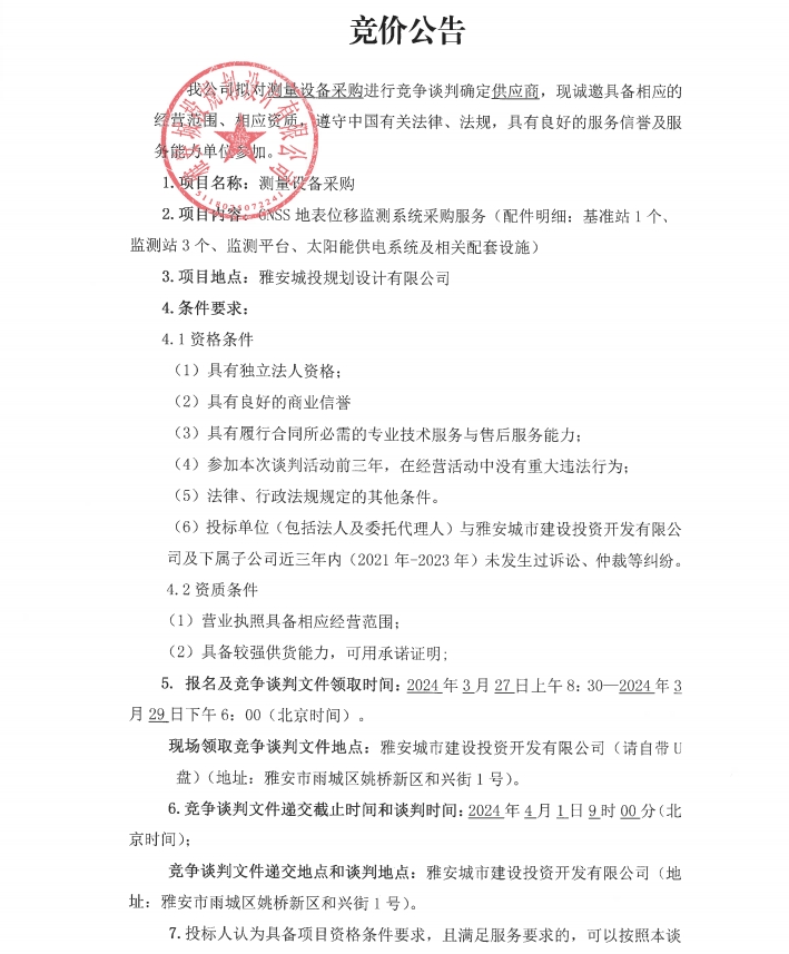 測量設(shè)備GNSS地表位移監(jiān)測系統(tǒng)采購競價公告