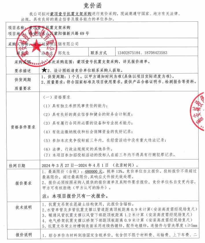 蒙頂壹號(hào)抗震支架采購競價(jià)公告