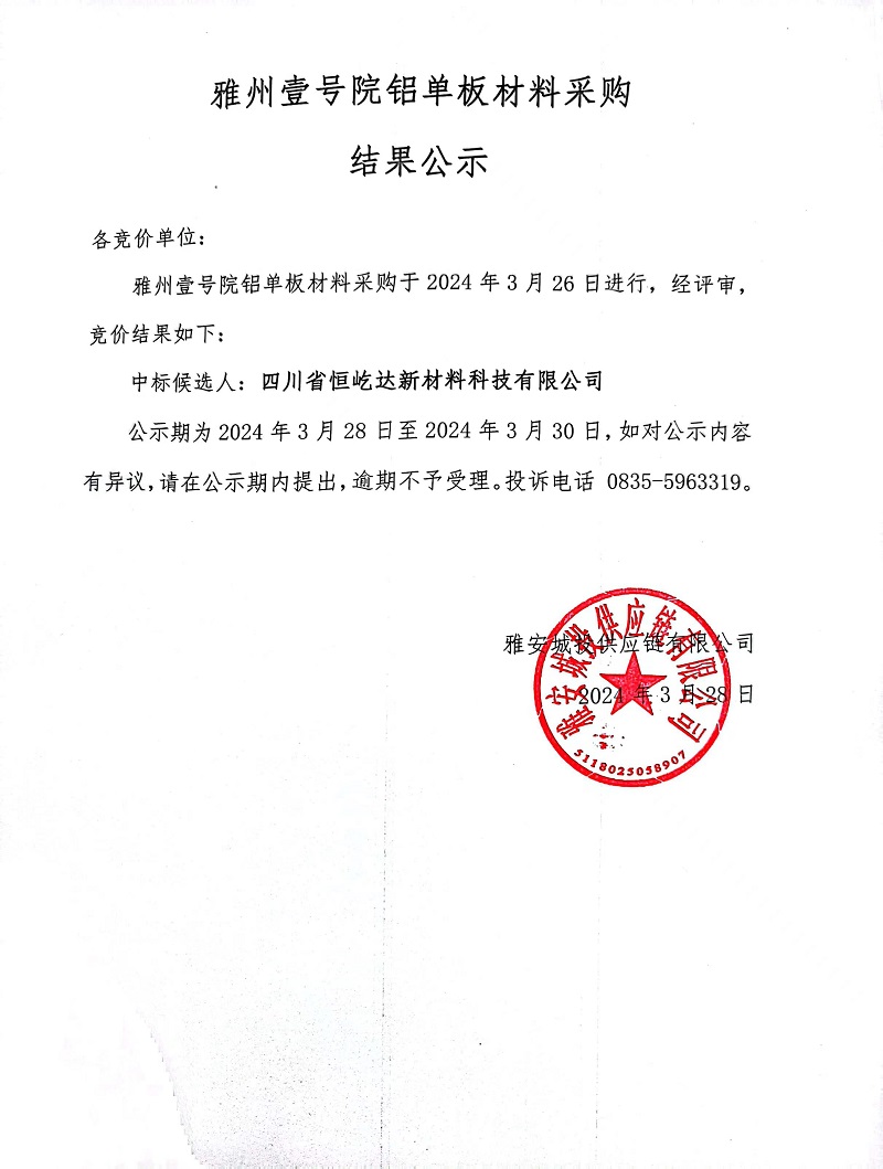 雅州壹號院鋁單板材料采購結果公示