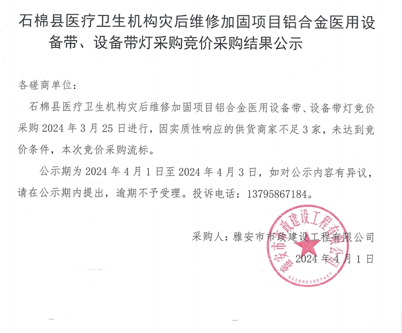 石棉縣醫(yī)療衛(wèi)生機(jī)構(gòu)災(zāi)后維修加固項(xiàng)目鋁合金醫(yī)用設(shè)備帶、設(shè)備帶燈采購競價(jià)采購結(jié)果公示