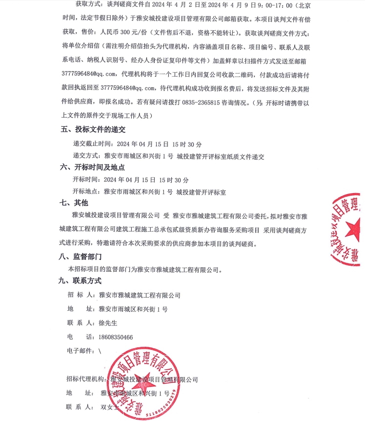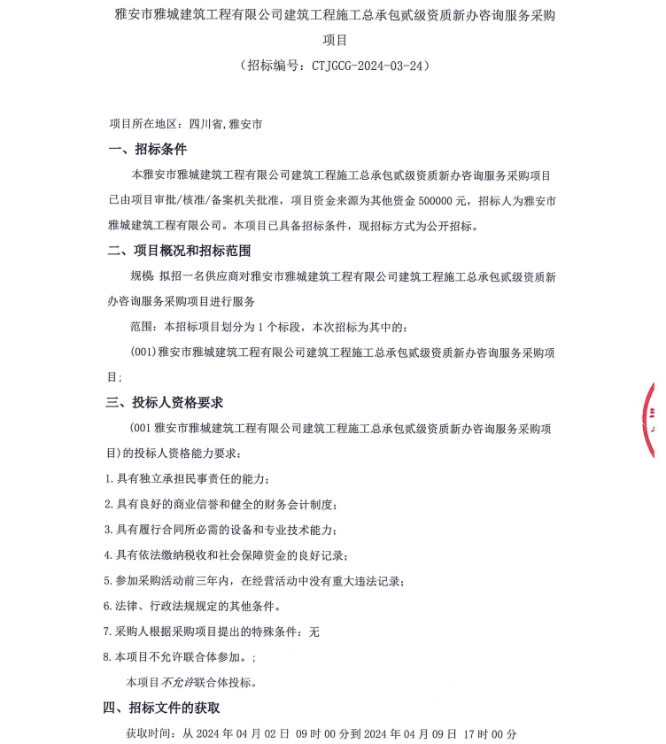 雅安市雅城建筑工程有限公司建筑工程施工總承包貳級資質(zhì)新辦咨詢服務(wù)采購項目公告
