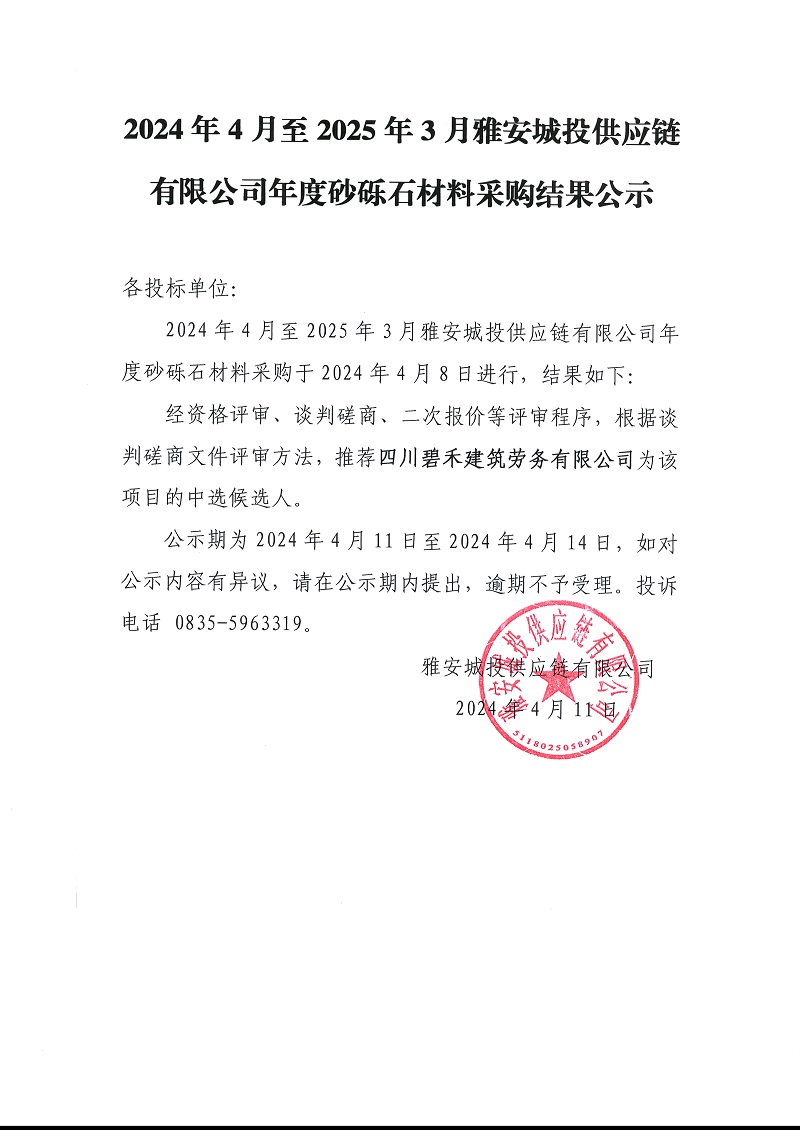 2024年4月至2025年3月雅安城投供應(yīng)鏈有限公司年度砂礫石材料采購結(jié)果公示