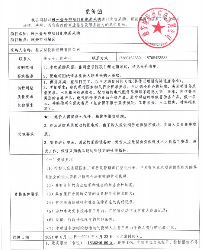雅州壹號院項目配電箱采購競價公告