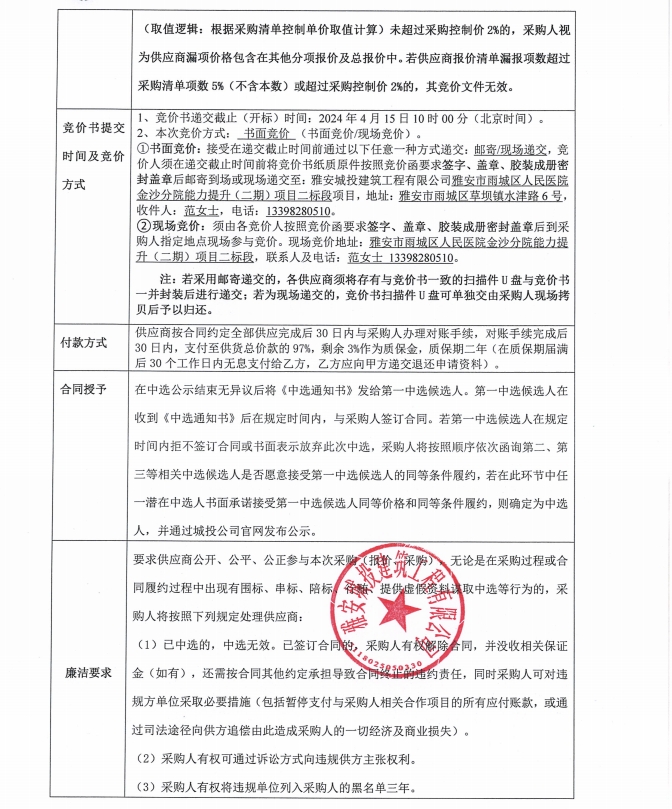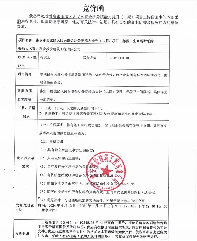 雅安市雨城區(qū)人民醫(yī)院金沙分院能力提升(二期)項(xiàng)目二標(biāo)段衛(wèi)生間隔斷采購競價公告