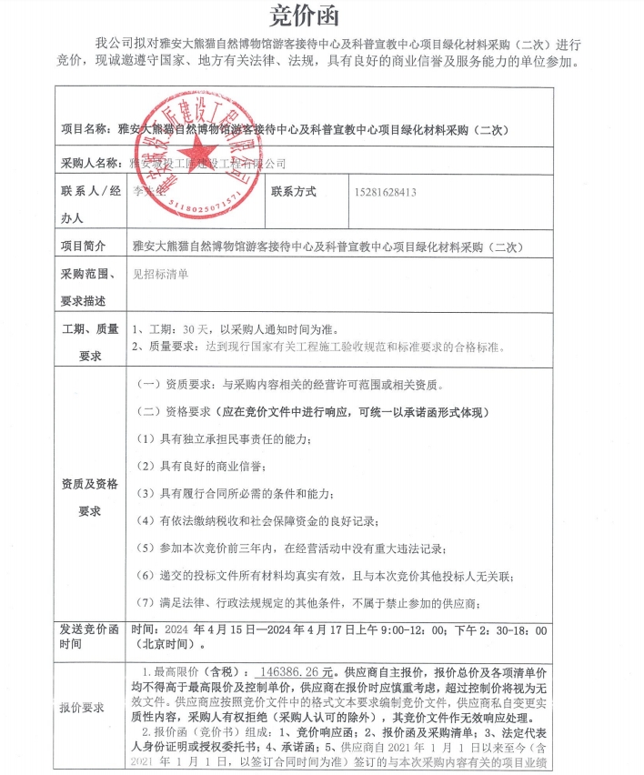 雅安大熊貓自然博物館游客接待中心及科普宣教中心項(xiàng)目綠化材料采購(二次)競價(jià)公告