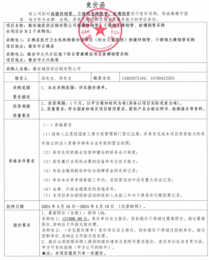 熱鍍鋅鋼管、不銹鋼無縫鋼管、玻璃鋼管競(jìng)價(jià)公告