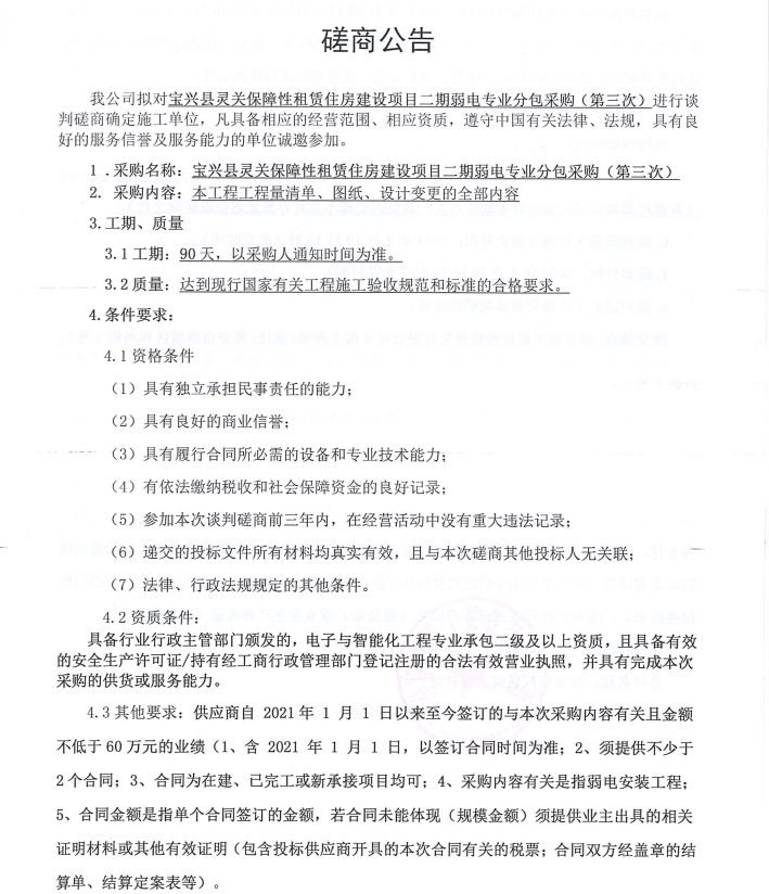 寶興縣靈關保障性租賃住房建設項目二期弱電工程專業(yè)分包采購(第三次)磋商公告