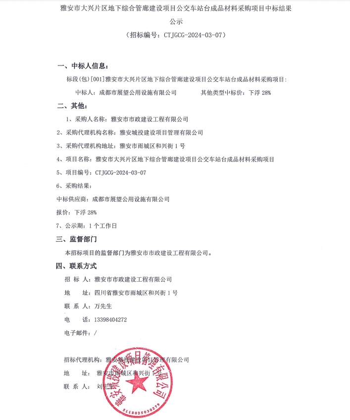 雅安市大興片區(qū)地下綜合管廊建設(shè)項(xiàng)目公交車站臺(tái)成品材料采購(gòu)項(xiàng)目中標(biāo)結(jié)果公示