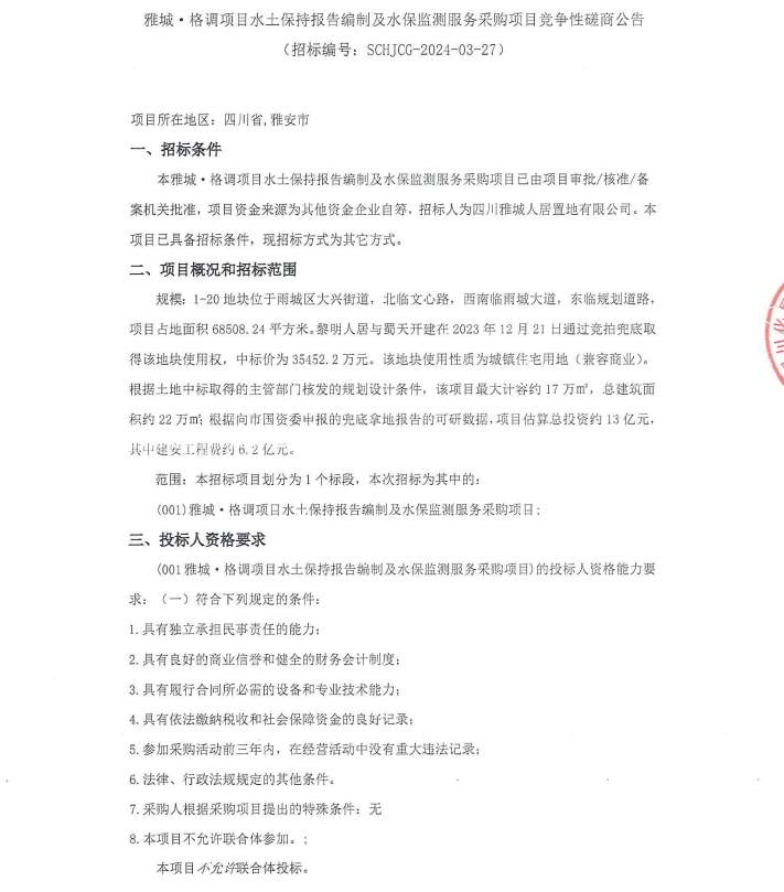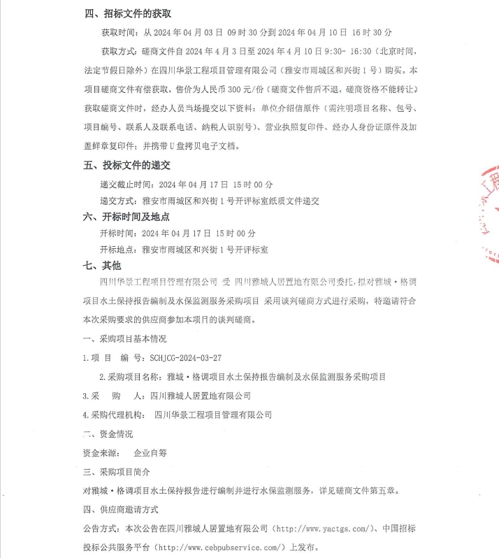 雅城·格調(diào)項(xiàng)目水土保持報(bào)告編制及水保監(jiān)測(cè)服務(wù)采購項(xiàng)目競(jìng)爭(zhēng)性磋商公告