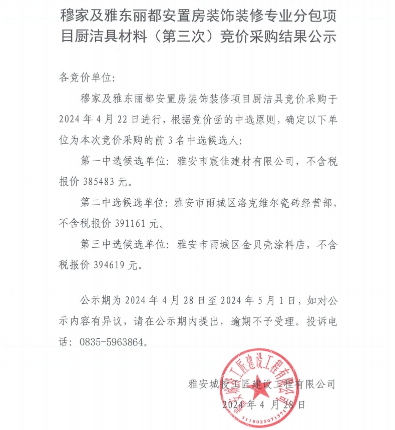 穆家及雅東麗都安置房裝飾裝修專業(yè)分包項目潔具材料(第三次)競價采購結(jié)果公示