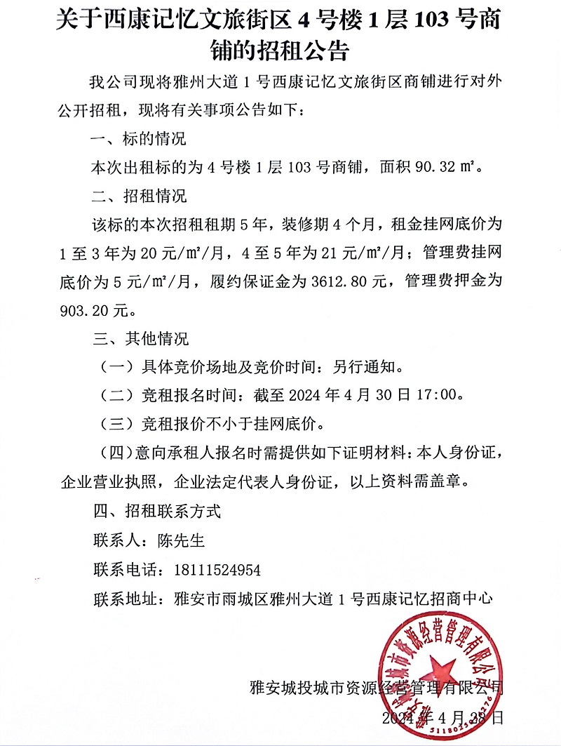 關于西康記憶文旅街區(qū)4號樓1層103號商鋪的招租公告