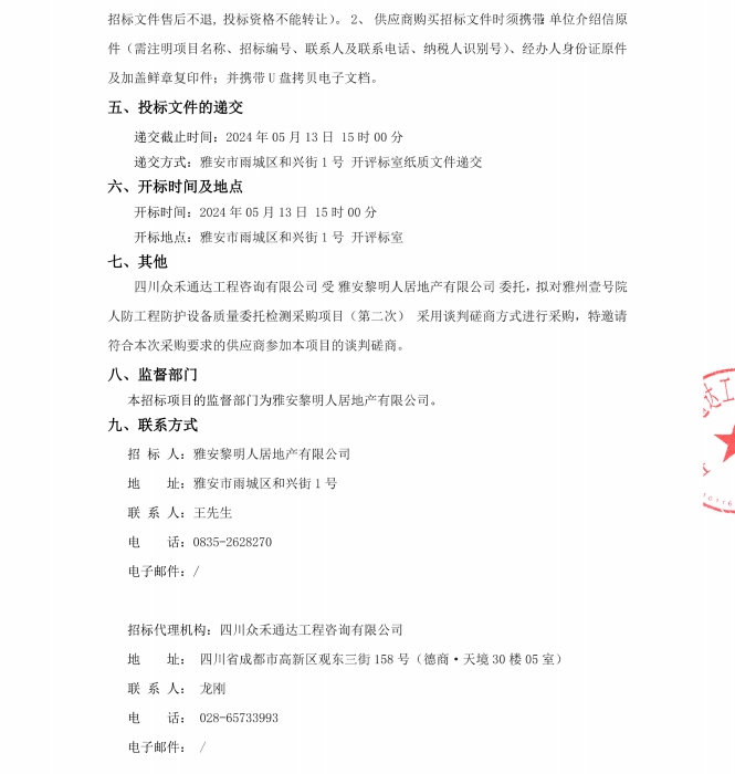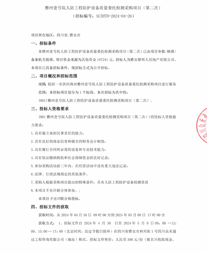 雅州壹號院人防工程防護(hù)設(shè)備質(zhì)量委托檢測采購項(xiàng)目(第二次)公告