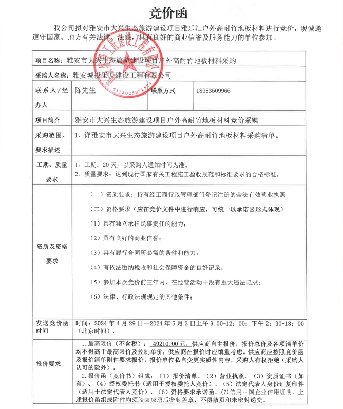 雅安市大興生態(tài)旅游建設(shè)項(xiàng)目霽雨橋、木棧道戶外高耐竹地板材料采購競價(jià)公告