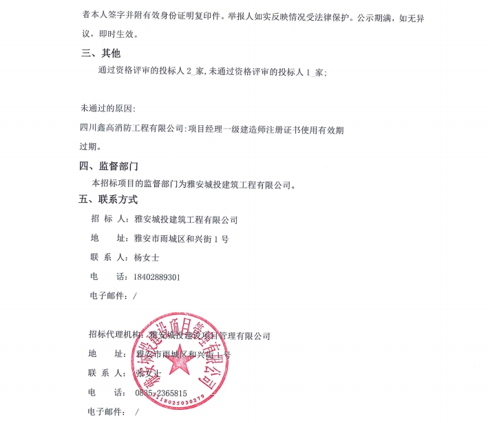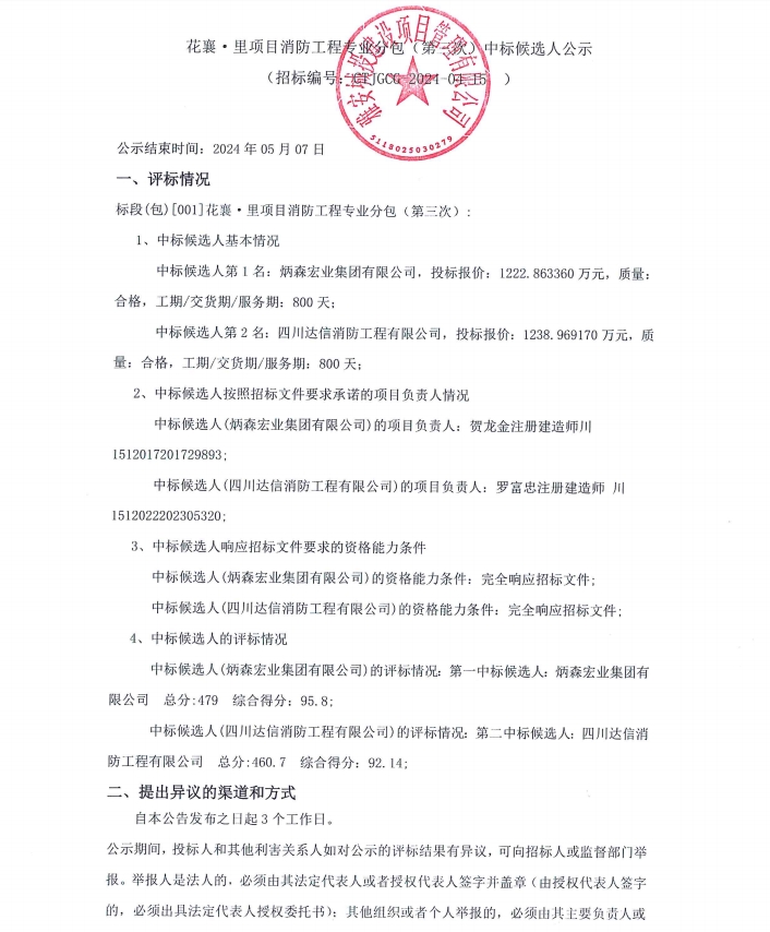 花襄·里項(xiàng)目消防工程專業(yè)分包(第三次)中標(biāo)候選人公示