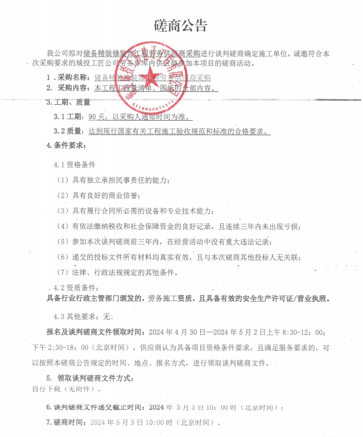 儲(chǔ)備精裝修裝飾工程勞務(wù)供應(yīng)商采購談判磋商公告