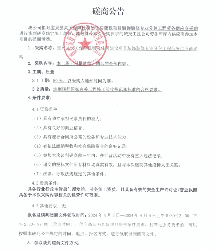 寶興縣靈關(guān)保障性租賃住房建設(shè)項目裝飾裝修專業(yè)分包工程勞務(wù)供應(yīng)商采購磋商公告