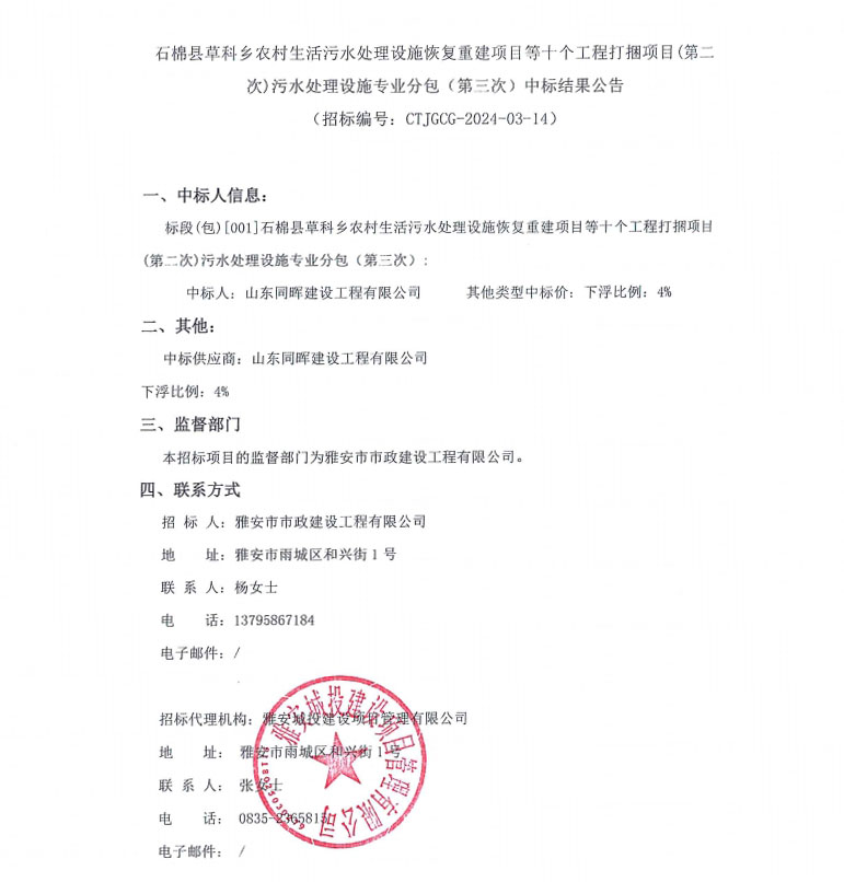 石棉縣草科鄉(xiāng)農(nóng)村生活污水處理設(shè)施恢復(fù)重建項(xiàng)目等十個(gè)工程打捆項(xiàng)目(第二次)污水處理設(shè)施專業(yè)分包(第三次)中標(biāo)結(jié)果公告