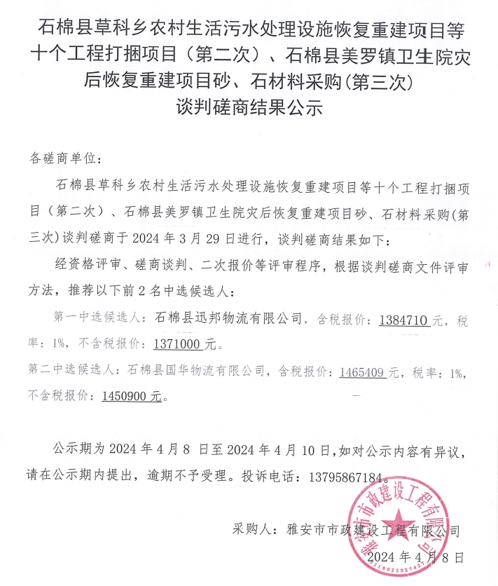 石棉縣草科鄉(xiāng)農(nóng)村生活污水處理設(shè)施恢復(fù)重建項目等十個工程打捆項目(第二次)、石棉縣美羅鎮(zhèn)衛(wèi)生院災(zāi)后恢復(fù)重建項目砂、石材料采購(第三次)談判磋商結(jié)果公示