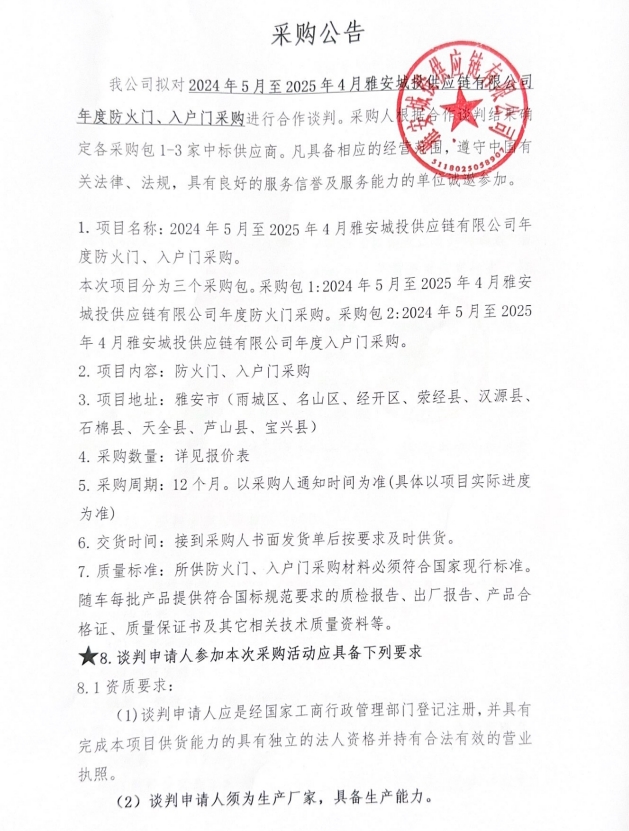 2024年5月至2025年4月雅安城投供應(yīng)鏈有限公司年度防火門、入戶門采購(gòu)公告