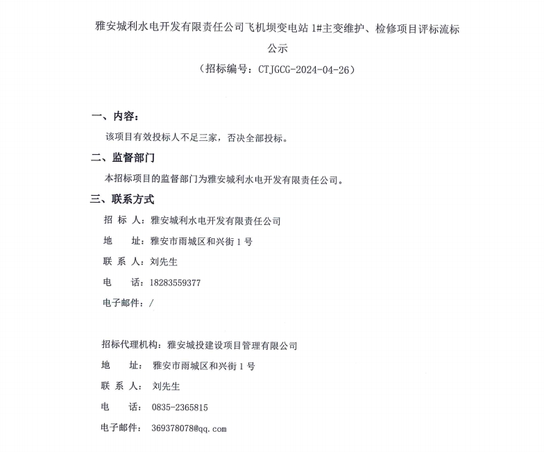 雅安城利水電開發(fā)有限責(zé)任公司飛機(jī)壩變電站1#主變維護(hù)、檢修項目評標(biāo)流標(biāo)公示
